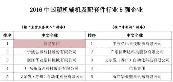 由中國塑膠機械工業協會組織的2016中國塑機行業優勢企業排序已出爐,經相關部門對參評企業提交資料的審計、核實和公示,並對公示階段提出的問題進行核對和解答後,確定出“2016中國塑機製造業綜合實力25強企業”、“2016中國塑膠注射成型機行業15強企業”、“2016中國塑膠擠出成型機行業10強企業”、“2016中國塑膠中空成型機行業3強企業”和“2016中國塑機輔機及配套件行業5強企業”名單。信易本年度喜獲中國塑機輔機5強企業之首。