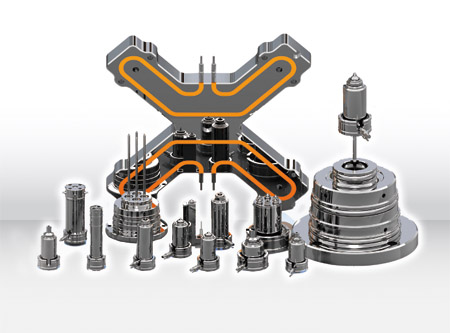 信舟熱流道提供標準與非標準兩種熱流道系統。如有可能,用戶應儘量選擇標準熱流道系統。既儘量選擇標準長度與尺寸的噴嘴,熱流道板,澆口鑲件等。其好處是標準熱流道系統比非標準熱流道系統價格低,交貨期要短很多。而且零件有互換性,有利於將來的使用與維護。常見的標準熱流道板的形狀有2腔一列,4腔一列,8腔一列,4腔X形狀,8腔XX形狀等。