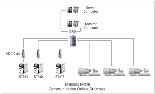 系統利用信易模溫機標配的RS485通訊接口。經過網関(ADC card)將RS485通訊轉換為以太網通訊接口,多台模溫機轉換後聯到網関(BAS)。通過車間的監控電腦監控及採集所有模溫機的資料並生成數據庫。客戶的服務器電腦讀取監控電腦數據庫的資料。在服務器電腦端把模溫機,注塑機,ERP的相關資料進行整合。