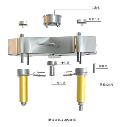 在熱嘴和流道板結合平面上採用了O型密封圈,O型密封圈用不銹鋼管制成,裝配時有2030鋼管直徑的預緊量防止熔體洩漏。這種結構形式非常適合低剛度的流道板和模具。