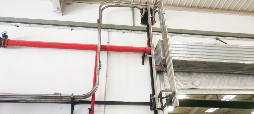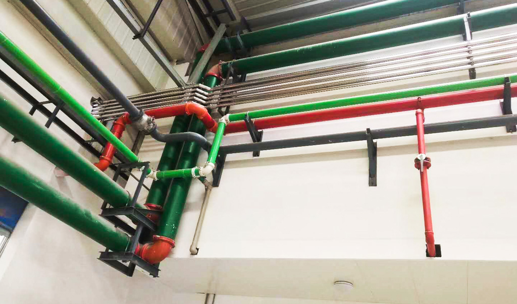 所有配管支撑以车间立柱、墙壁、吊顶或其它支撑物作管支架固定,不但美观,且排列整齐,保持优雅观感的同时还充分利用了厂房的上部空间;集尘桶远离生产现场放置可以维持生产现场的整洁环境。