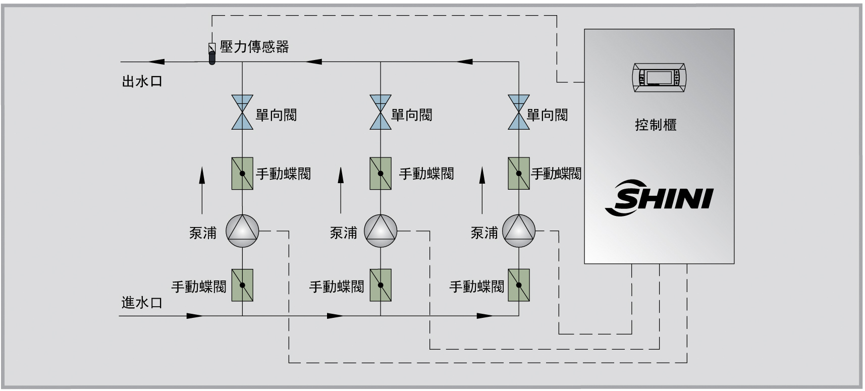 完善的自我保护功能:水泵执行先开先停运行原则,实现水泵均匀使用,延长水泵使用寿命;如某台泵出现故障时,系统发出报警信息且能自动启动下一个正常泵运行,以维持供水平衡;万一自控系统出现故障时,用户可以直接操作手动系统,以保证供水。