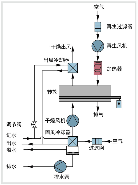 SMD-H采用预除湿与精除湿同步运作的原理。预除湿时外界湿空气在冷却器中与冷冻水间接接触,空气中的大量水分由于低温形成凝结为露水进入到露水收集容器中,当露水达到设定液位就会触发水泵,将露水自动排出。精除湿主要以蜂巢转轮为主要吸湿装置,可以提供连续稳定的低露点干燥空气。吸湿之后的蜂巢转轮经过高温再生,重新具备吸料能力,实现连续式除湿。除湿之后的低露点干燥空气经过后置冷却器再进入产品成型区域。