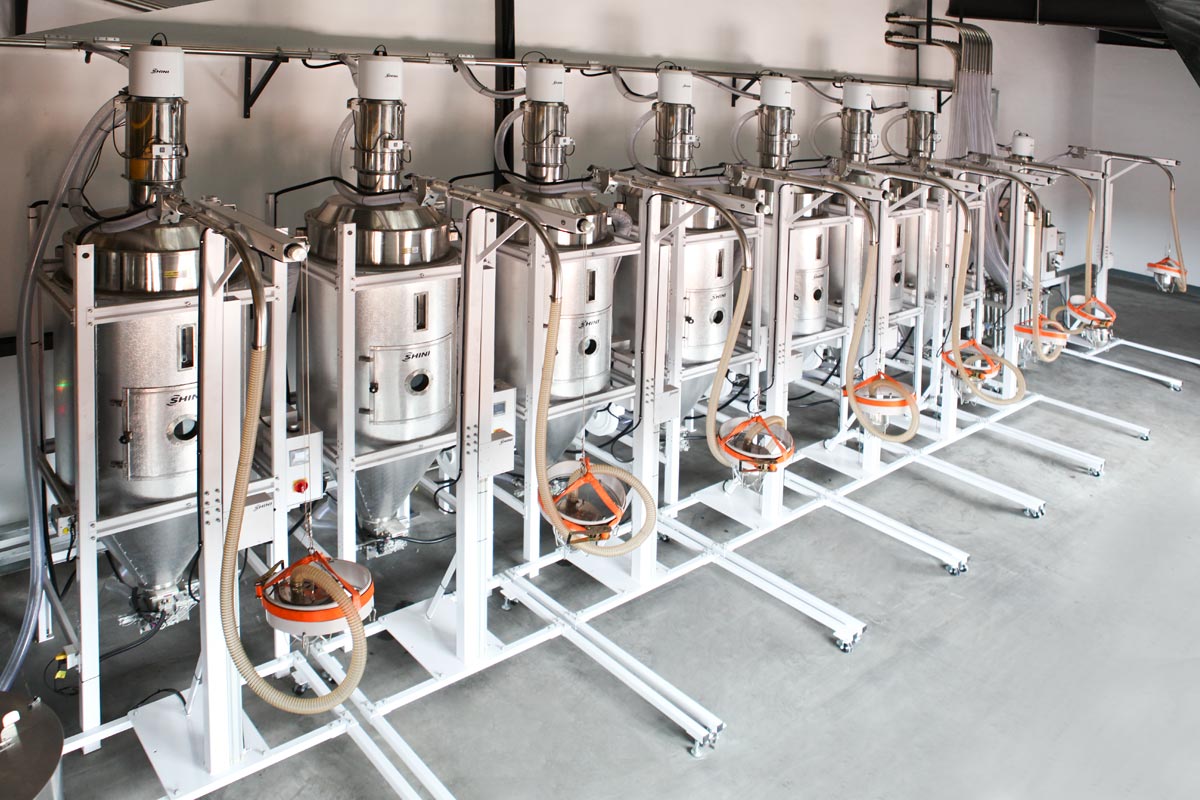 整体原料处理系统采用吨包袋自动吸料装置,将太空包中的原料通过负压方式输送至塑料干燥设备,从根本上改善传统单纯靠人力值守的作业方式,极大降低吨包料的排空工作量。从吨包袋送出的原料进入到干燥机内经历热风干燥的过程,脱出料粒内部的水分实现预干燥,满足成型工艺需求。干燥后塑料在风机的作用下经过中央原料分配站输送到各个不同注塑机台,操作人员可以按实际工艺需求灵活自由切换塑料输送路径,使系统具备极高的自由度,实现少人化干预。仅在需要更换原料的时候人力切换塑料类别及设定控制参数,选料简单明了,几分钟即可完成。如若选错塑料类型,系统可自动识别,基本实现无人值守作业,系统运行后全程只需一人即可照顾整体系统,提高生产效率,缩短生产周期,改善车间工作环境。