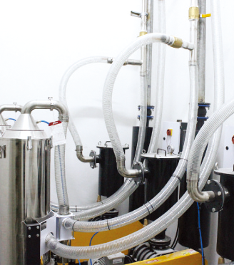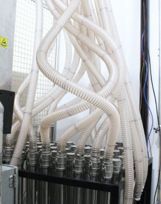 In this workshop, material dosage was 17kg/hr per unit. The total dosage amount of the first phase was 289kg/hr. There were 3 material hoppers in 500kg capacity that equipped in the room (include dosing amount for second phase). The ABS material requires the drying treatment, which was centrally processed by Dryer of the customer. We only needed to convey the material to the Dyer. For customer’s requirement to make the three kinds of materials available in 17 sets of the IMM, we set up a set of material distribution station in the room. The inlet of material distribution station was connected to the outlet of hopper and Dryer. The pipeline of each injection molding machine was extending to material distribution station, with quick connector mounted. Then the operator could easily switch the material in each machine via the quick connector. The workshop of the 17 sets of IMM was divided into 2 areas, and each area was equipped with a set of central vacuum generator SRB-80-V for central air supply. There’s an extra set of blower for backup, which was connected with two sets of blowers in series. When the blower breaks down, it could quickly switch to the backup blower, which ensures normal operation of the whole system.