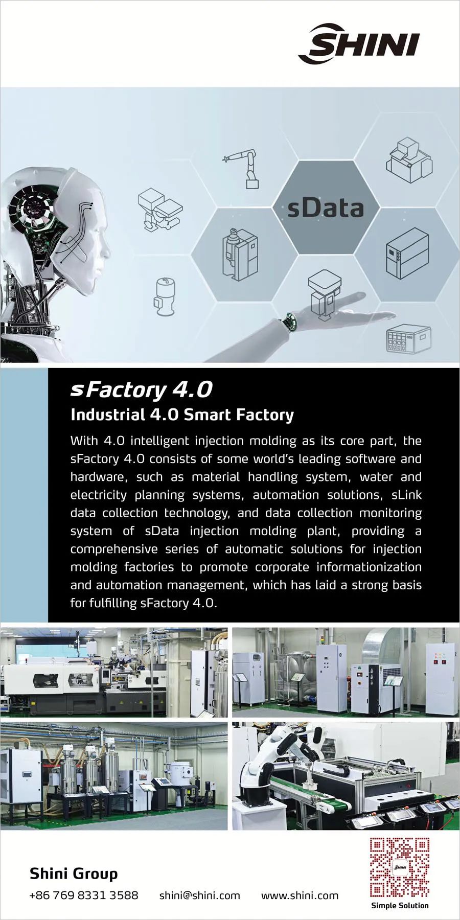 Established in 1969, Shini has experienced over 53 years of development. Now it offers eight series of products to the market through consistent research and progress, covering plastic material processing (dehumidification & drying, conveying, mixing, etc.), mold temperature control, water treatment (cooling water and chilled water system), plastic recycling and reusing, robot, hot runner, and systematic solution, as well as the whole process of the injection molding production. In the future, the era driven by the data is coming toward us, and the data from production, running equipment, etc., will push informatization progress. Currently, Shini is launching the smart injection moulding plant to the market, and it can provide an integrated intelligent whole plant solution of the auxiliary equipment based on digitalization and informatization. In addition, Shini auxiliary equipment can match the systematic plans well in practice to make all develop in-depth and expand in scope, providing the market with one-stop, simple, and practical solutions.