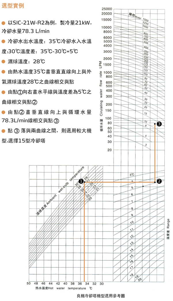 因地區性環境(濕球)溫度的不同,客戶亦可參照下面附圖選型實例,自行依選型標準選擇相對應的機型。若採用其他品牌的冷卻塔,亦請參照良機型號選擇規格相近的水塔,若因選型過小而造成冷水機故障,本公司一概不負責。為避免存在冷卻塔型號過小而造成故障的狀況,請必須在信易提供的專業技術支援下安裝和使用。