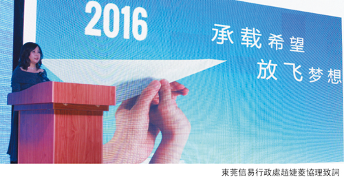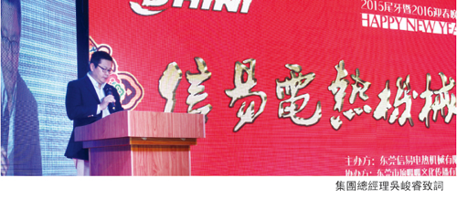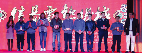 17點35分,隨著倒計時的音樂結束,晚會正式拉開帷幕。首先是激動人心的開場水鼓表演,參演女孩們靚麗的容顏、優雅的動作、激昂的鼓聲,讓全場氣氛瞬間被點燃。然後,信易集團總經理吳峻睿先生致新年賀詞,賀詞中總經理對2015做出回望並對2016提出新的期望,讓廣大同仁對新的一年更加信心倍增,昂首向前。接著請行政處趙協理分別從生產、銷售、研發、行銷、企業文化、公司榮譽與發展等方面,配合幻燈片,全面系統地回顧了信易2015年所取得的成就。當講到因2015年國內外經濟低迷,許多業內同行業績大幅下滑,但信易業績不但沒有下降,反而提升1.6個百分點時,現場響起了熱烈的掌聲;當講到東莞信易新廠房建設時,看到螢幕上投映的建設效果圖,優美的環境,讓現場的同仁大為驚歎;講到信易牌商標榮獲“中國馳名商標”稱號時,現場再一次響起熱烈的掌聲。