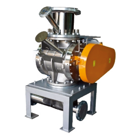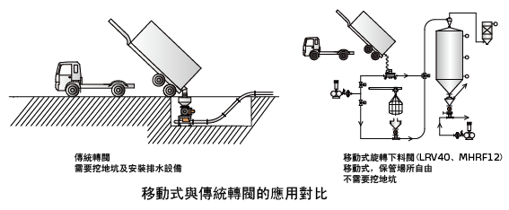 •移動式旋轉下料閥是專門為集裝箱車粉體卸料、噸袋、小包裝投料設計,設計為從上蓋接受原料、從本體下部排出原料。採用貫流式結構,直流管側面接輸送氣管,粉體和空氣混合後直接輸送到料倉。側蓋採取特殊設計可以耐較高的輸送壓力,採用了貫流式結構省去了混合室,有效降低了設備的高度。採用高壓輸送方式,可輸送較遠的距離、搞混合比輸送提高了輸送效率。可做移動式或固定式,標準裝配帶腳輪。