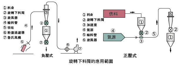 轉下料閥是以供給粉粒體為目的,設計最精良的定量供給機器,在空氣輸送裝置等有壓力差的場所使用,可以發揮最大的效果。輸送的原料包括各種塑膠、食品(小麥、小麥粉、砂糖、其他)、礦物(煤、水泥、其他)。