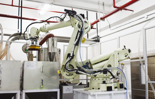 該企業採用了機器人供料以後,員工只需在放料區放好原料,機器人可以從放料區取出袋裝的原料,然後在料筒上割開料袋,直接在料口上方供料。另外,機器人供料不僅可以實現自動化生產也能長時間地工作,提高機器稼動率。