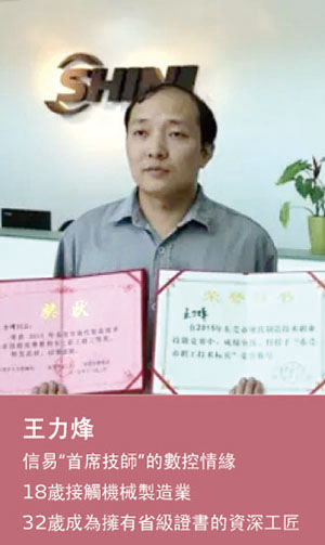 今年32歲的王力烽,是東莞信易電熱機械有限公司一名資深數控車床技術員。他從18歲開始與機械設備打交道,入職信易公司8年,不僅為多項生產設備改進做出貢獻,還多次代表企業參加我市崗位職業技能大賽,多次獲獎。