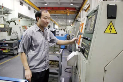 在東莞信易電熱機械有限公司的生產車間裏,一排排整齊的機械設備正在有條不紊地運行中,資深數控車床技術員王力烽正在熟練地操作著自己負責的設備,並不時走到同組兩個年輕同事身邊進行操作指導。