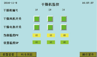此套系統採用了中央操控系統,把兩台吸料機都集中到系統中去,用戶只需在一台控制器上即可操作兩台吸料機,且人性化的操作介面,使用戶操作起來更加簡單方便。同時,為了方便工人操作及查看,該系統配備了兩個觸摸屏,主控制箱上的觸摸屏安置在儲料桶旁,另一個則安置在注塑機機臺上。另外,由於乾燥機料桶都是安放在平臺上,工人每次操作和查看都需要爬上平臺,這樣就給工人操作和維護都造成了一定的不便。為此,我們把三台乾燥機的控制也集中到該中央操控系統當中,通過西門子S7-200自帶的PID演算法,使乾燥溫度一直穩定在設定值範圍內,其超溫報警和乾燥風機運行等也集中在該系統中;此時,用戶只需在中央操控系統人機介面上便可方便地控制乾燥風機、乾燥電熱的運行及乾燥溫度的設定,給生產和維護提供了大大的方便。