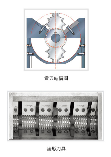 齒形刀具由於其外觀形似菠蘿,故也稱為菠蘿刀,其結構及加工工藝都比較複雜,一般與爪形刀具配合使用,爪形刀具可以輕鬆的抓住和破壞較大的水口料,實現粗粉碎,而齒刀可對粗粉碎後的物料進行更細致的粉碎,最終獲得需求的粉碎料尺寸。粗粉碎和細粉碎同時進行,粉碎效率高。該類型刀具結構的優勢在於其設計的刀具轉速低,粉碎噪音小,同時無篩網的設計減少了易損件篩網的成本投入,但是其劣勢也很明顯,其粉碎量較小,並且由於其刀具結構複雜,其初期的設備投入成本也較高。此類型的刀具結構一般用於水口料的粉碎,使用此刀具的粉碎機主要放置於注塑機邊使用,代表機型有SG-24N及SG-14系列機型。
