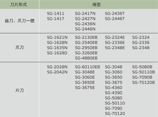 片形刀具采用漸切式設計和V型切割技 術。漸切式的設計結構類似於家用的剪刀,對物料實現逐步粉碎,降低了粉碎阻力,但相較於爪形刀具,其動刀片與定刀片間的切角角度較小,因而其可保證粉碎室的有效粉碎空間更大,更易於抓取物料,所以更適合粉碎大型的空殼類的物料。V型切割技術則主要用於粉碎室尺寸較大的機型,對於這些機型,其粉碎室的長度較長,若每排動刀或定刀使用一片刀片,則刀片的加工成本會提升,使用的便利性下降,故一般將刀片分為兩片,呈現V形排列,此結構可優化刀具的尺寸,並且在粉碎時將物料向中心位置推送,降低粉碎室兩側結構的磨損,提升了粉碎室中間部位的粉碎效率。片刀的定刀一般固定於粉碎室機架上,動刀固定在刀架上隨刀架軸旋轉,其動定刀間隙可以利用調刀架在機外實現間隙調整,方便快捷。使用片形刀具的粉碎機,主要代表機型有SG-30/36/43/50/70及相對應的E系列機型,主要用於對物料實現集中粉碎。