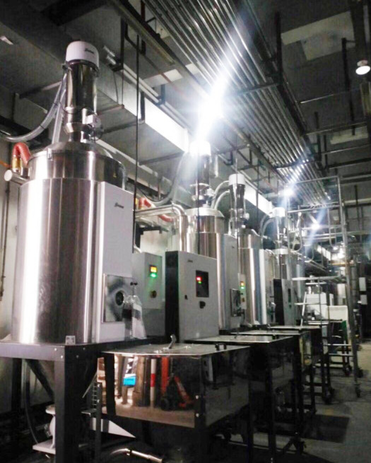 因應生產的需求,客戶需要在其新車間上線一套中央原料處理系統,該期系統針對PP、PET、LDPE、HDPE、PET等材料,共計30台注塑機的用料量進行規劃,整體的處理工藝包含原料乾燥、混合以及集中輸送。
