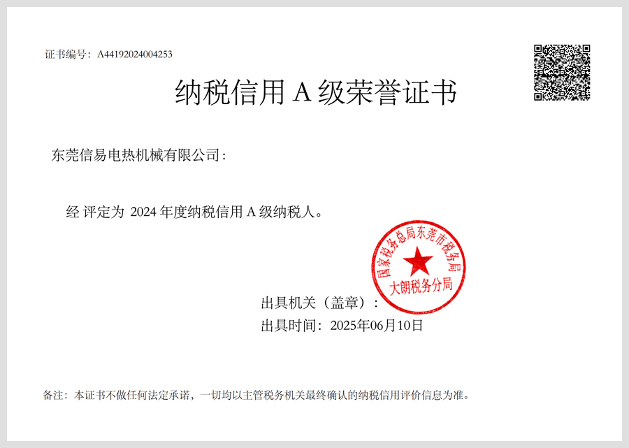 东莞信易电热机械有限公司 2024年 经 国家税务总局东莞市税务局 评定为 “纳税信用 A 级纳税人”,该评级是纳税人依法履行纳税义务,并被社会所普遍认可的一种信用评级,是社会信用体系建设重要内容之一,同时也是相关行政执法部门对企业在税务及财务管理方面的高度认可。