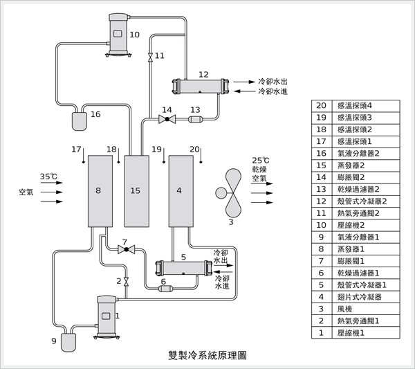 冷凍式除濕機工作原理之一是採用雙製冷系統,空氣通過蒸發器1與冷媒發生熱交換帶走部份熱量,再經過蒸發器2與冷媒熱交換繼續降溫,達到露點要求。在此過程中水分析出排走,最後通過翅片式冷凝器,吸收冷凝器放出的熱量提高出風溫度由鼓風機將空氣送到所需場所。