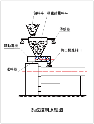 採用失重原理,通過PLC及變頻器控制餵料機螺桿的輸出量,使其滿足一定的螺桿填充比例以達到餵料的目的。由於採用了稱重計量,精確地反映出實時的餵料量,通過閉環控制(如圖:系統控制原理圖)達到精確餵料的目的。