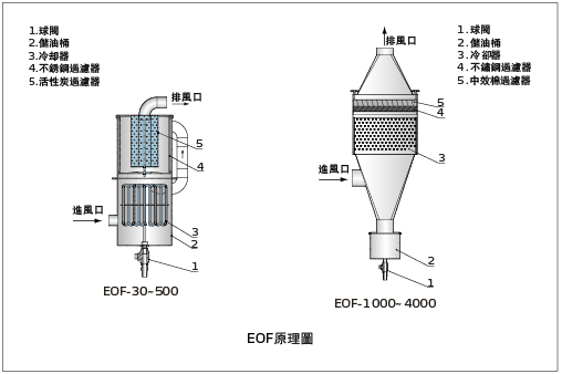 EOF-30~500機型採用活性炭過濾方式。含有增塑劑的高溫回風首先經過冷卻器,將氣態增塑劑及少許水蒸氣凝結為液態油水混合物被排除。剩餘混合氣體則首先通過第一層200目不銹鋼過濾器,濾出大部份的油粒,再經過活性炭過濾器過濾掉空氣中的細微油粒,從而除去回風中的增塑劑油粒。