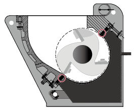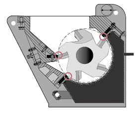 高切點型固定刀起始切點高,設計的粉碎室餵料空間要小,使得切割作用力不會過強,提高了切割較大實心材料的可靠性,所以此設計適用於粉碎厚壁、厚片和較大實心材料。